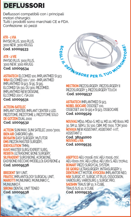 Deflussori compatibili con i principali motori chirurgici. Tutti i prodotti sono marchiati CE e FDA. Confezione: 10 pezzi